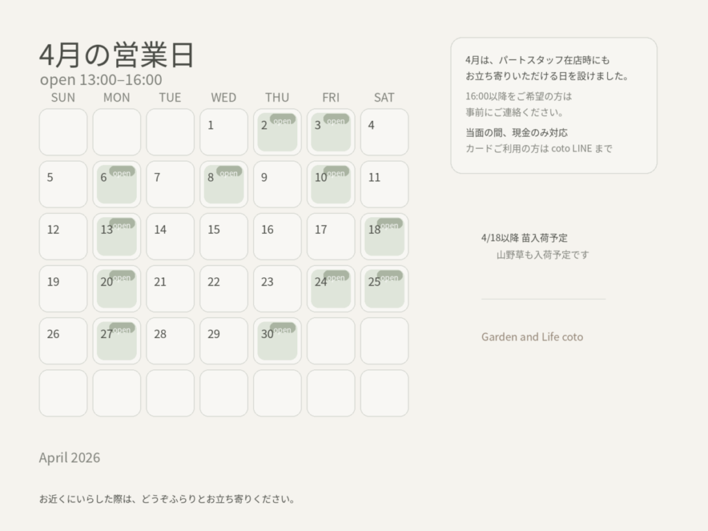 店主お庭事業のInstagramです。cotoの情報もストーリーズに掲載しております。ぜひご覧下さい。